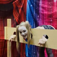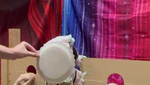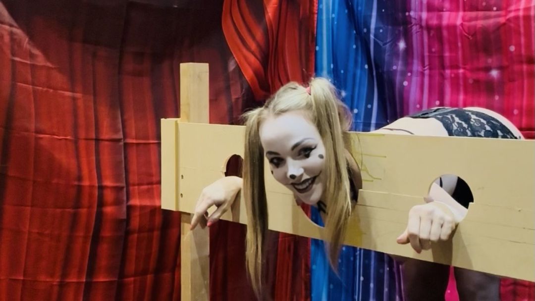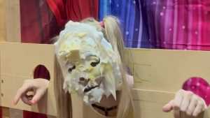 Naughty Alice gets locked in the pillory and pelted with pies to the face, boobs and bum.