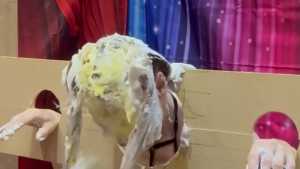 Smiling as she enjoys the humiliation in stockings, suspenders and a cut out bra, she receives multiple custard and foam pies as well as a big sloppy pie to her tits and two delivered to her helpless butt.